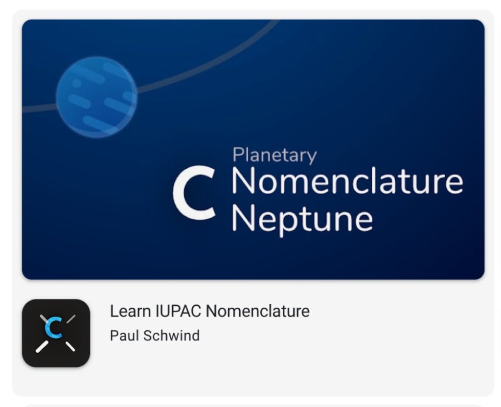 The app is called Nomenclature Neptune (also found under the name ‘Learn IUPAC Nomenclature‘) and is available for both Android and Apple iOS devices. The developer of the app is Paul Schwind, who has also created other educational applications.