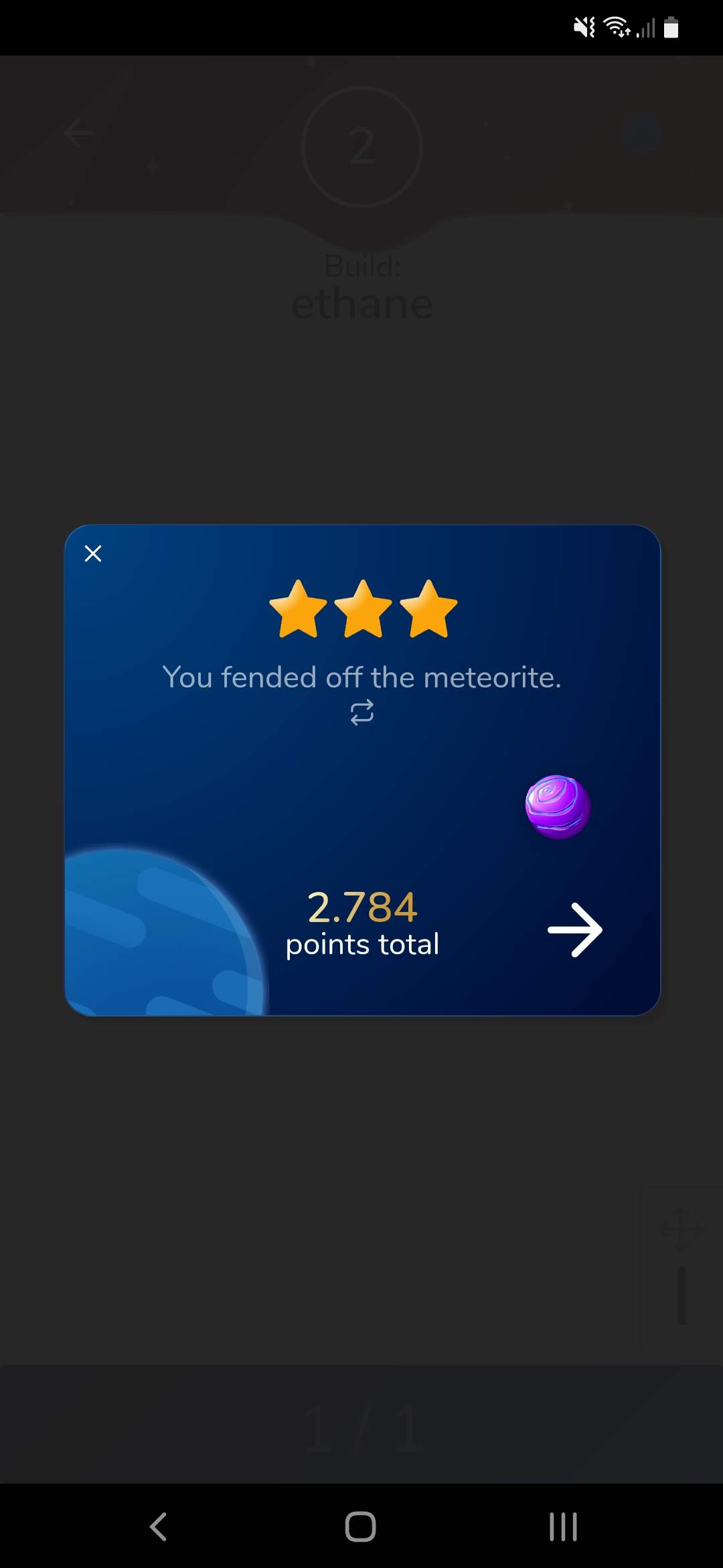 Then I drag a carbon, and on the screen appears the first C, bonded to 4 Hs. I draw a line, and automatically another C is added, with the system adjusting the number of hydrogens: the formula appears as CH3––CH3. I say okay, and… I’ve entered the correct formula; the app tells me, ‘You fend off the meteorite!’